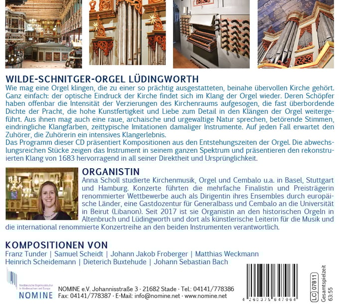 Doch zuerst zu den für diese Einspielung ausgewählten Instrumenten: Beiden ist die Wertschätzung der jeweiligen Orgelbauer durch Dietrich Buxtehude eigen. Die Orgeln in den „Bauerndomen“ von Altenbruch und Lüdingworth (an der Elbmündung bei Cuxhaven gelegen) besitzen zwei Instrumente aus der Zeit des Komponisten, beide vor einigen Jahren durch die renommierte Orgelbaufirma Ahrend detailgetreu restauriert und klanglich wieder an das frühbarocke Klangbild angenähert (hohe Chorstimmung mit a' = 478 Hz, Werkmeister-Temperatur in Altenbruch, in Lüdingworth sogar auch wieder in mitteltöniger Stimmung).