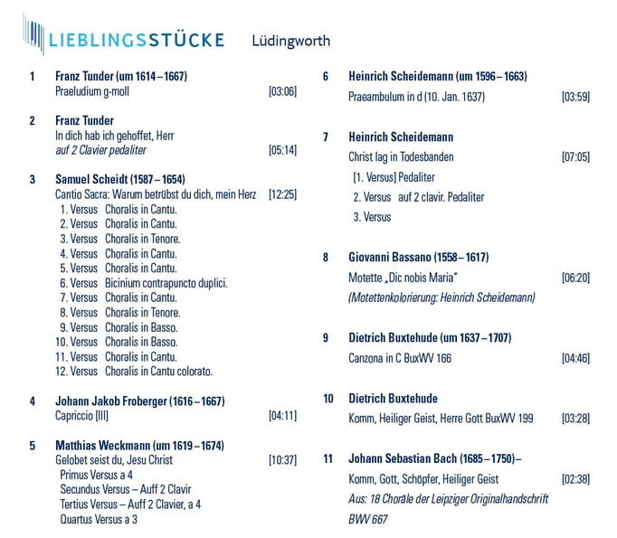 Kompositionen von Byrd, Scheidt, Sweelinck, Scheidemann, Tunder, Böhm, Buxtehude und J.S. Bach portraitieren die klangliche Vielfalt beider Instrumente.